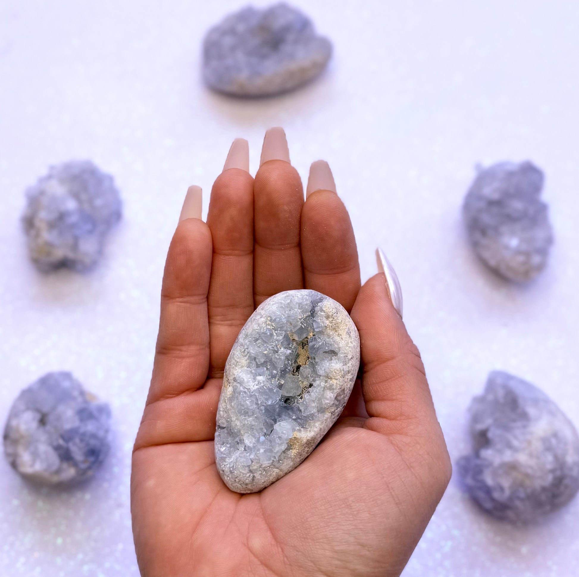 Celestite is the 'Crystal of Heavenly Peace' and it carries serene, celestial energy that connects youthful to higher realms, angelic guidance and inner tranquility.