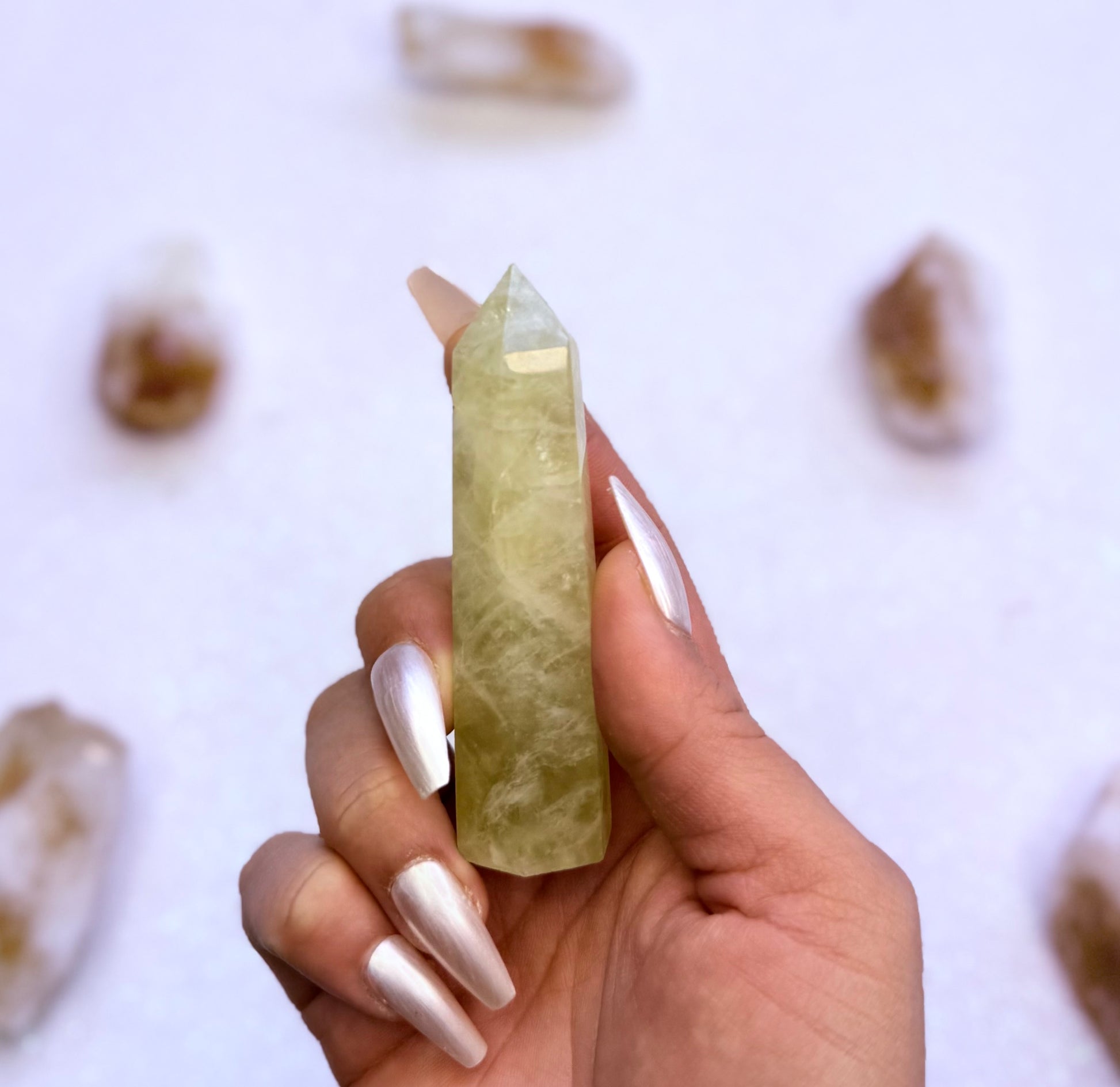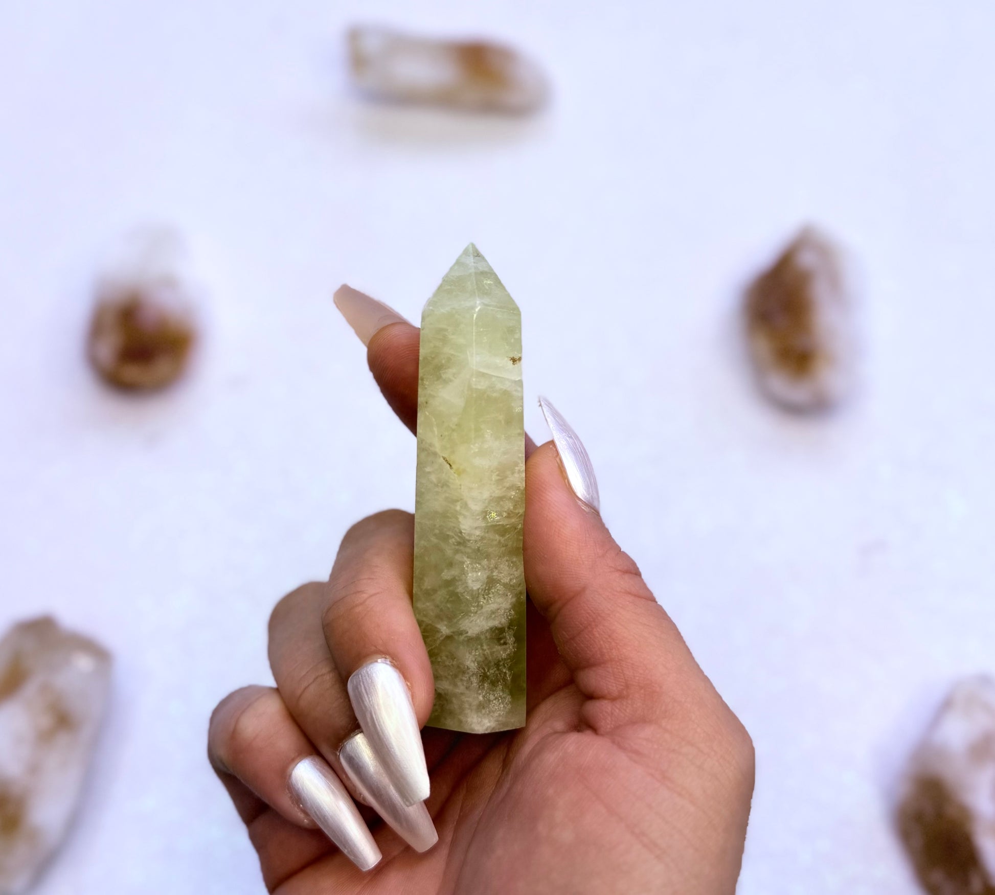 Crystal Type: Point tower. Pointed towers are known to enhance focus and direction as the pointed top channels energy upward and outward and assists in focusing your energy and manifestations in your desired direction. The flat base anchors and grounds energy into the earth and encourages stability. The pointed tip and the flat base creates a balance between the higher realms and the physical world.