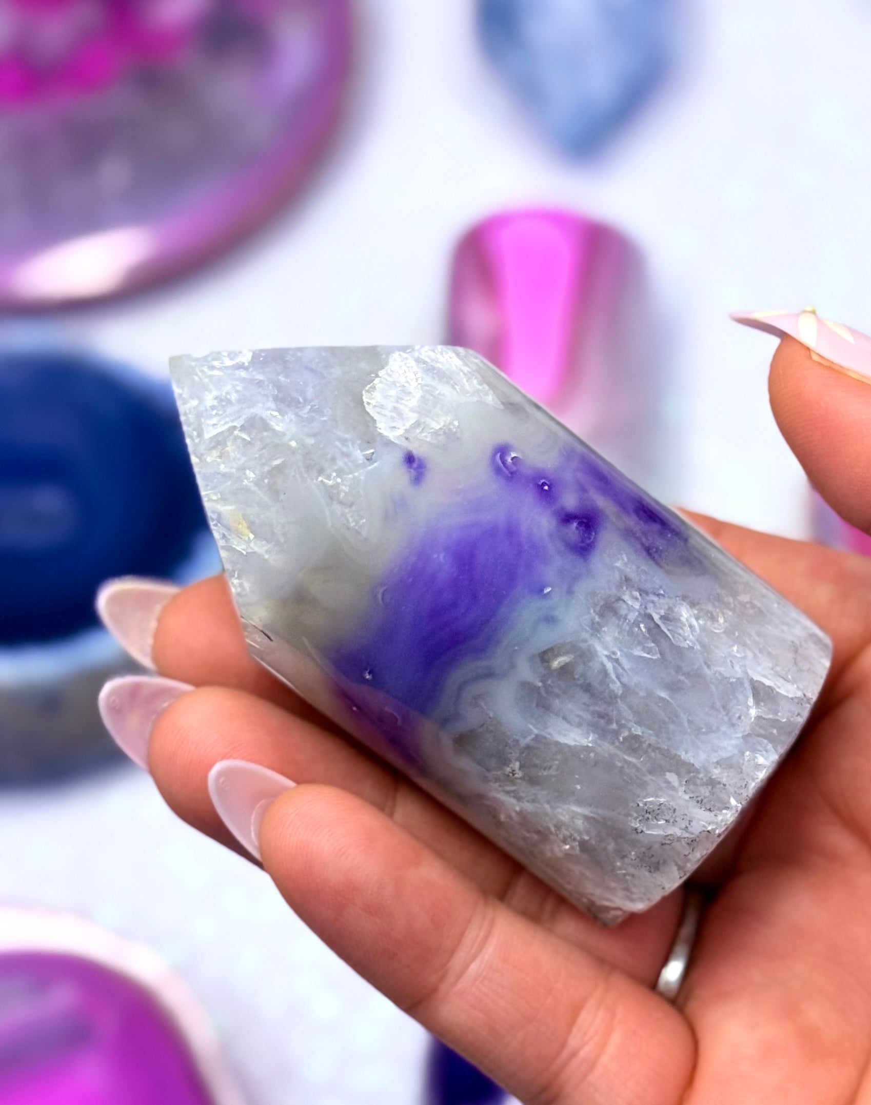 Purple Agate is a soothing stone of serenity that calms overactive thoughts and emotions that creates a soft energetic protection around the aura and opens a gateway to higher wisdom and deep intuition. This stunning crystal is particularly potent in the dreaming life and is known to assist with to quiet an overactive mind and and anxiety before bed, promote restful sleep, encourage vivid dreams, protect from unsettling dreams and support dream recall. Purple Agate is beneficial for those with heavy waking lives and those with careers like health professionals, customer service representatives, conflict mediators, those in the legal system, educators, energy workers and artists.